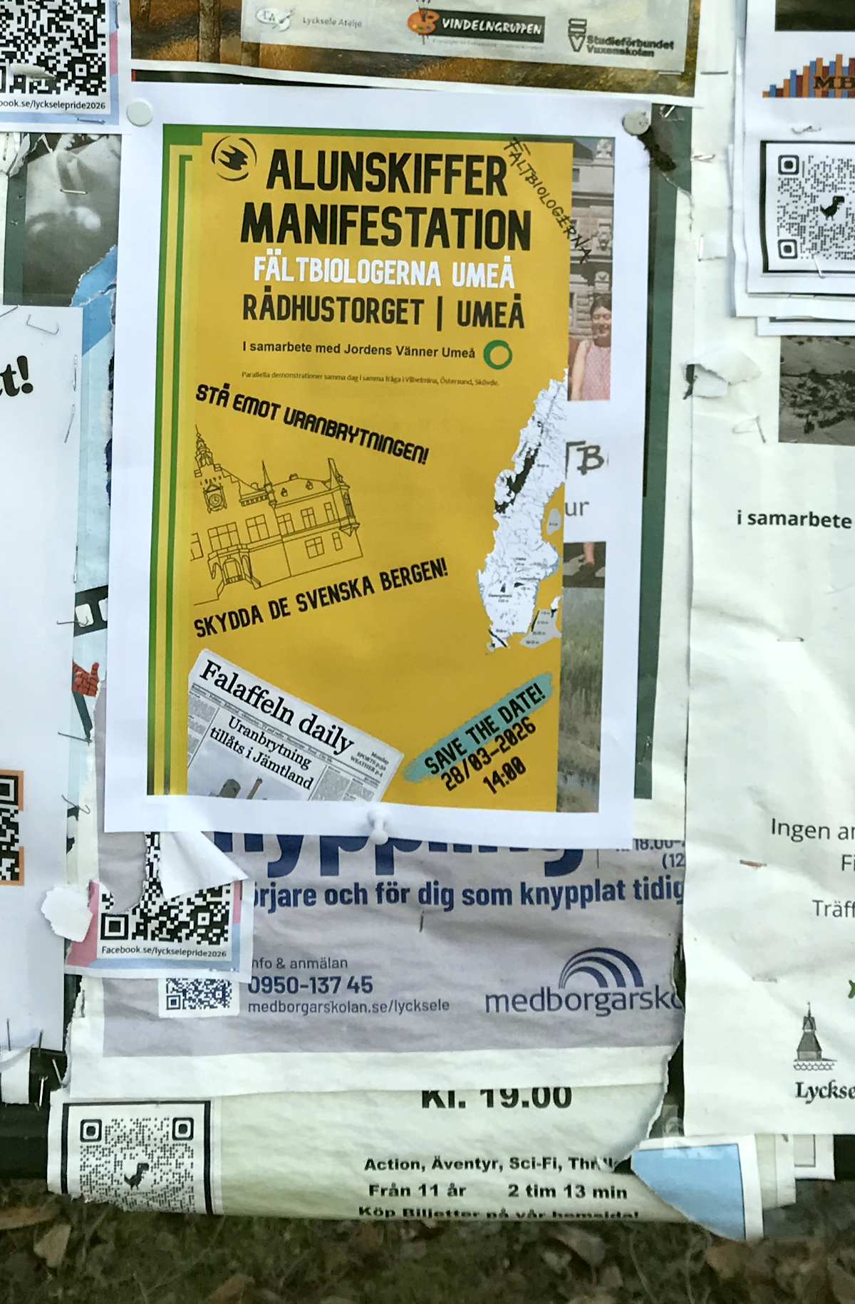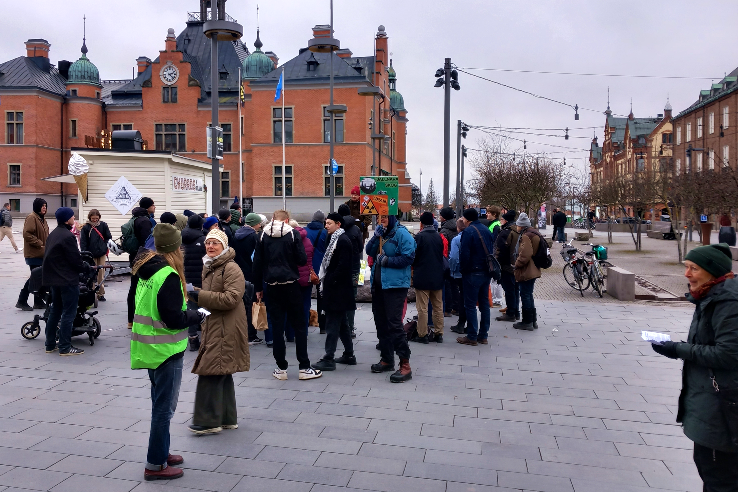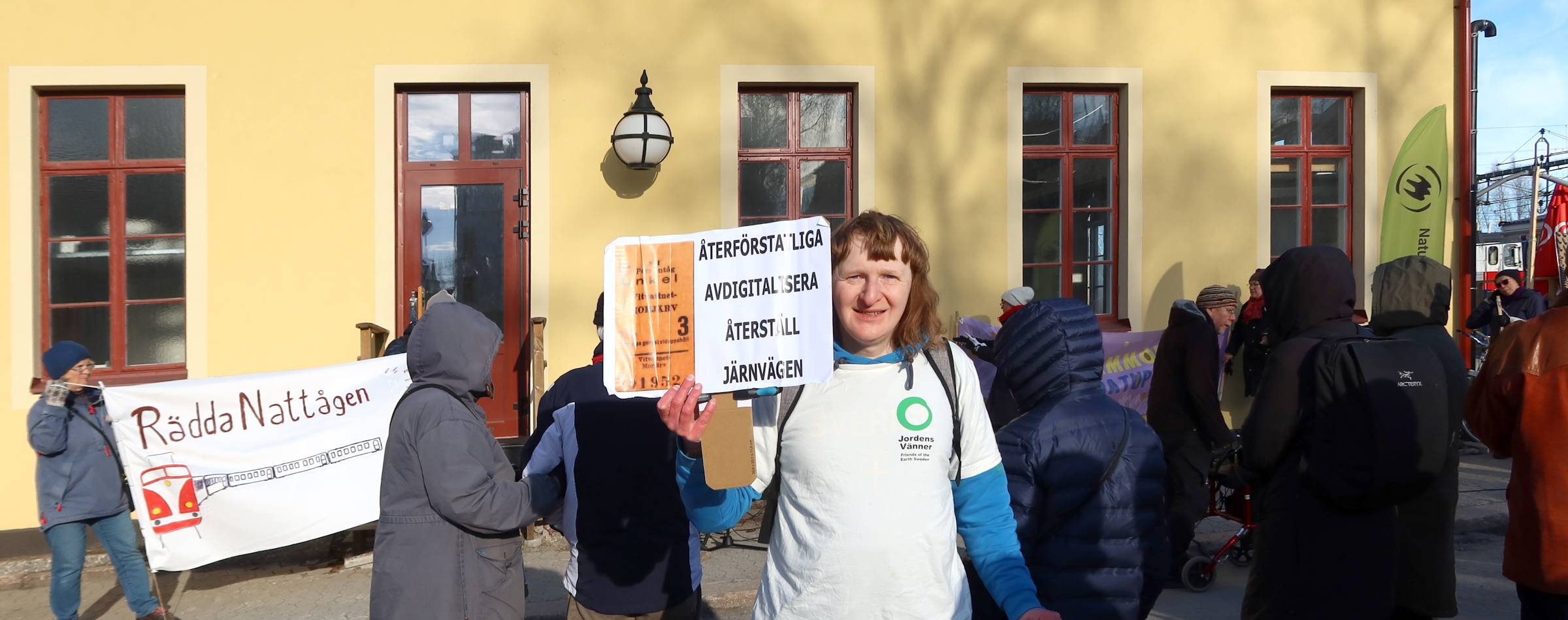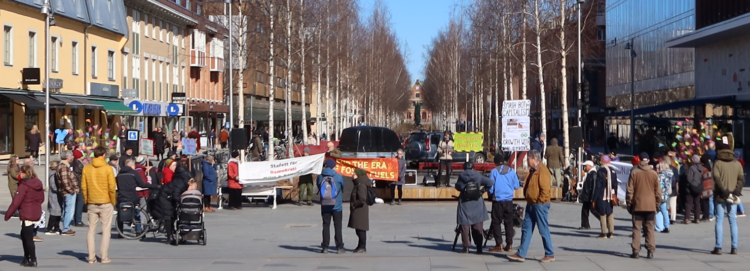 AktiviteterArkiverade tidigare aktiviteter Klicka på en bild för att se den i full upplösning. 2026-04-09 och 2026-04-10 Stafetten kommer till Luleå, Boden och UmeåTvå grupper miljöaktivister reser under början av aprilmånaden genom Sverige, i mån av tillgänglighet med tåg, dels från Abisko söderut, och dels genom södra Sverige, och möts till sist i Stockholm för att genomföra en politikerutfrågning (KK, OO) och en stor klimatmarsch i syfte att köra högerfascisterna ut ur regeringskansliet. Aktionen kallas för Stafetten eller Valstafetten. Stafetten sysslar med antihögerpolitik med fokus på klimat och miljö, men tar upp även några andra frågor såsom rättvisa och migrationsväsendet AKA deportationsväsendet. På onsdag 2026-04-08 började den norra gruppen med en hyfsat stor demo (bild)i Abisko, detta trots att en del deltagare söderifrån inte nådde fram pga tågstrul. Tåget väntade ca 30 minuter i Älvsbyn pga ett påstått växelfel i Boden. Då tåget äntligen nådde staden Boden, stannade det ca 3 Km före stationen (som fortfarande heter "centralstation" trots att den är den enda järnvägsstation inom hela kommunen), föraren vägrade öppna dörrarna, och efter ett tag fick resenärerna veta att tåget ska köra tillbaka till Älvsbyn där de skulle byta till en ersättningsbuss. Look what's happening in Sweden. På torsdag 2026-04-09 var Stafetten aktiv i Luleå, Boden och Älvsbyn. Under kvällen reste gruppen till Umeå, och kunde i Boden bevittna en ilsken resenär som efter intensiv användning av "moderna" digitala kommunikationskanaler under 3 dagar inte lyckades få sanningsenlig information, och körde med hyrbil från Giron till Boden, trots att det till sist fanns en ersättningsbuss, och tåget väntade på den. "Jag ska aldrig åka tåg igen, det här funkar helt enkelt inte!" var dagens slutsats för denna resenär. Look what's happening in Sweden. Ankomsten till Älvbyn var försenad med en timme, men ett fint gäng väntade kvar på perrongen för en träff som dröjde ca en minut innan tåget körde vidare. Ankomsten till Umeå var försenad med ca 1+1/2 timmar, tågförseningar växer lika tillförlitligt som kancertumörer eller gruvor, det är bara så. Två mindre gäng delade ut flygblad på både Umeå Central och Umeå Östra omkring kl 21 som var tågets avsedda passertid, men ingen var kvar då tåget var framme. På fredag 2026-04-10 var Stafetten aktiv i Umeå, och utökade den traditionella fredagsdemonstrationen på Rådhustorget från kl 12. Senare kl 15 blev det ett inomhusevenemang på Väven (stadsbiblioteket) med flera talare inklusive Arne Müller, och efterföljande diskussion. Avgången vidare söderut blev senarelagd från fredag kväll till lördag morgon, därmed föll också den tidigare övervägda aktionen på Cetralstationen bort. ![]() Demo framför järnvägsstationen i Luleå med stöd från Umeå ![]() Demo framför järnvägsstationen i Luleå med stöd från Umeå ![]() Demo framför järnvägsstationen i Boden med stöd från Umeå ![]() Protest i stationshuset i Boden mot ett dysfunktionellt heldigitaliserat biljetteringssystem ![]() Demo på Rådhustorget i Umeå, Mattias talar om skog och träplantager, och strategin att driva frågan via Luleå kommun och sedan Umeå kommun, i bakgrunden syns järnvägsstationen ![]() Välbesökt föredrag på Väven (bilden är Public Domain i den mån den kan vara det utifrån tänkbar tredjeparts upphovsrätt på loggan på duken) 2026-03-28 Demonstration mot brytning i alunskifferJordens Vänner Umeå deltog i en demonstration mot brytning i alunskiffer, övrig extraktivism, nya kärnreaktorer och statlig kärnvapenterrorism på Rådhustorget i Umeå, 2026-03-28, lördag, början kl 14:00. Arrangörer och delaktiga var nätverket "Sverige mot brytning i alunskiffer" (ingen webbplats, men en insändare finns), Fältbiologerna Umeå, Jordens Vänner Umeå, Naturskyddsföreningen Jämtland (mer info om alunskiffer), Amnesty Sapmi, MittSkifte (online namninsamling och mer info om alunskiffer). Talare: Taylor, Jordens Vänner Umeå (talet), Erik D, nätverket "Nej till uranbrytningen". Samma dag anordnades det demonstrationer i samma ärende på 4 ställen, nämligen Umeå, Vilhelmina, Östersund och Skövde. ![]() Affisch i Lycksele (bilden är Public Domain i den mån den kan vara det utifrån tänkbar tredjeparts upphovsrätt på affischerna) ![]() ![]() ![]() ![]() 2026-03-21 Demonstration mot USAJordens Vänner Umeå deltog med en talare (talet) i en demonstration i centrala Umeå mot USA och deras notoriska krigande och miljöförstöring. 2026-01-31 Socialistiskt Forum 2026Jordens Vänner Umeå och några andra miljöorganisationer närvarade med bokbord vid "Socialistiskt Forum 2026" i Umeå. Arrangörer var LO-facken i Umeå, Socialdemokraterna i Umeå, Vänsterpartiet i Umeå, Ung Vänster, SSU, ABF Umeåregionen, ABF-distriktet i Västerbotten, Kulturföreningen Pilgatan (Bokcafé Pilgatan), Unga Örnar Umeå. ![]() 2025-12-13 LuciademoPå Luciadagen (lördag) ägde rum den nästan traditionella demonstrationen för "Klimat, Fred och Humanism" anordnad av den samlade miljörörelsen och fredsrörelsen i Umeå. Avgång kort efter kl 12:00 från Järnvägstorget till Renmarkstorget där det hölls korta tal. Jordens Vänner Umeå samlades under banderollen "Rädda Nattåget", vi intervjuades av SVT, och delade ut flygblad om nattågsnerdragningarna. Efter demonstrationen följde kl 13:00 ett evenemang inomhus. ![]() Vår bandelroll "Rädda Nattåget" på Järnvägstorget, Umeå Centralstation i bakgrunden ![]() Vår bandelroll "Rädda Nattåget" på Renmarkstorget ![]() Renmarkstorget, flera av Jordens Vänner Umeå syns 2025-11-06 Presentation "Grön omställning eller business as usual"Presentation "Grön omställning eller business as usual" med anledning av den nyligen hållna gruvkonferensen i Älvsbyn (2025-10-04 till 2025-10-05 arrangerad av