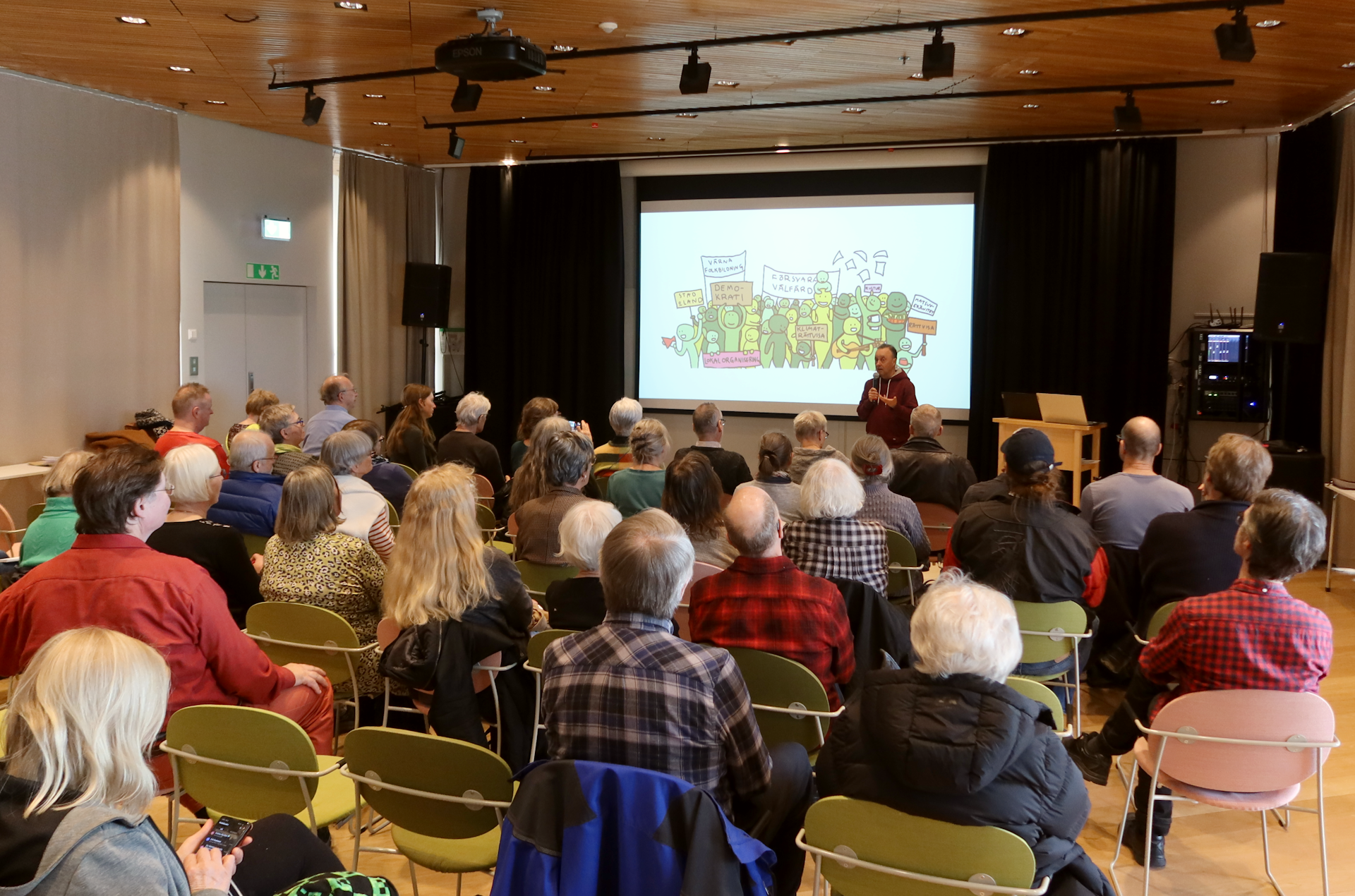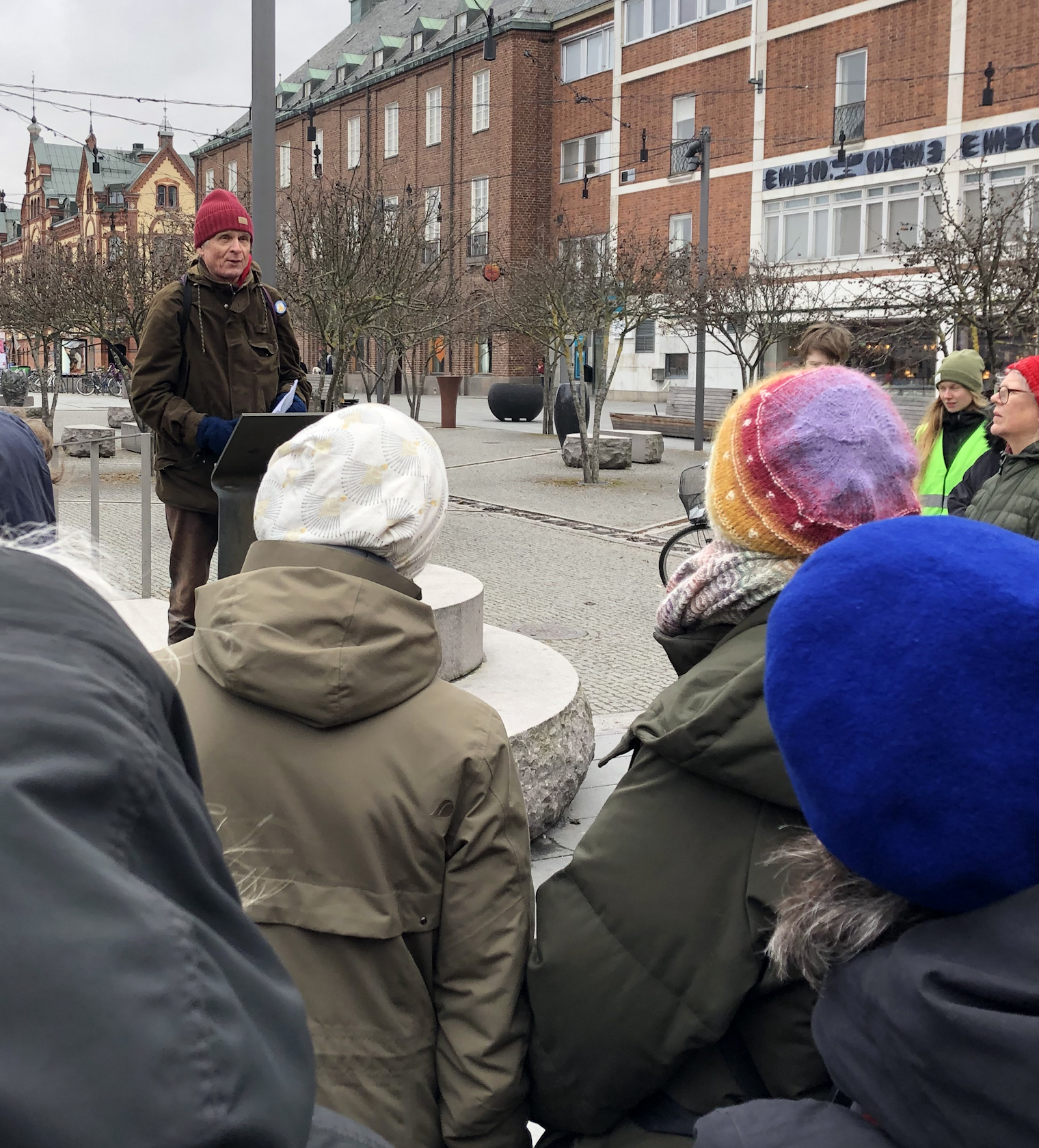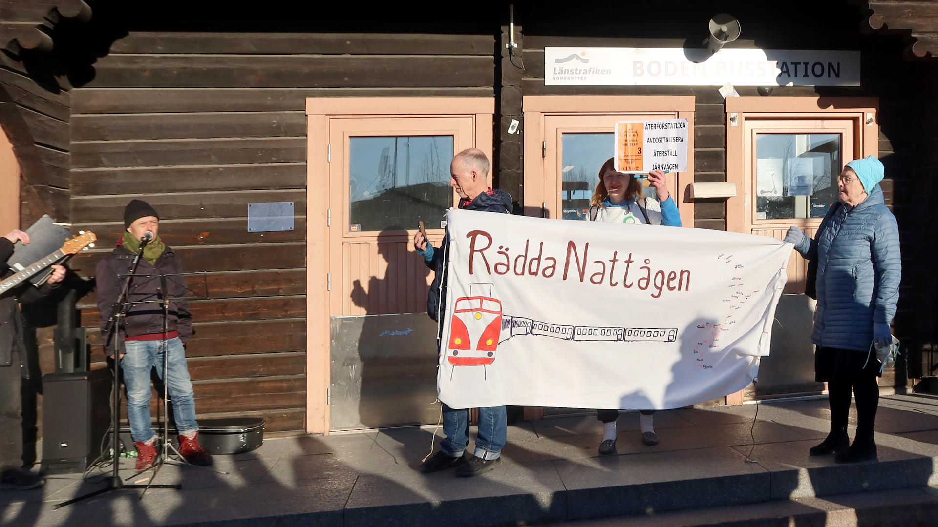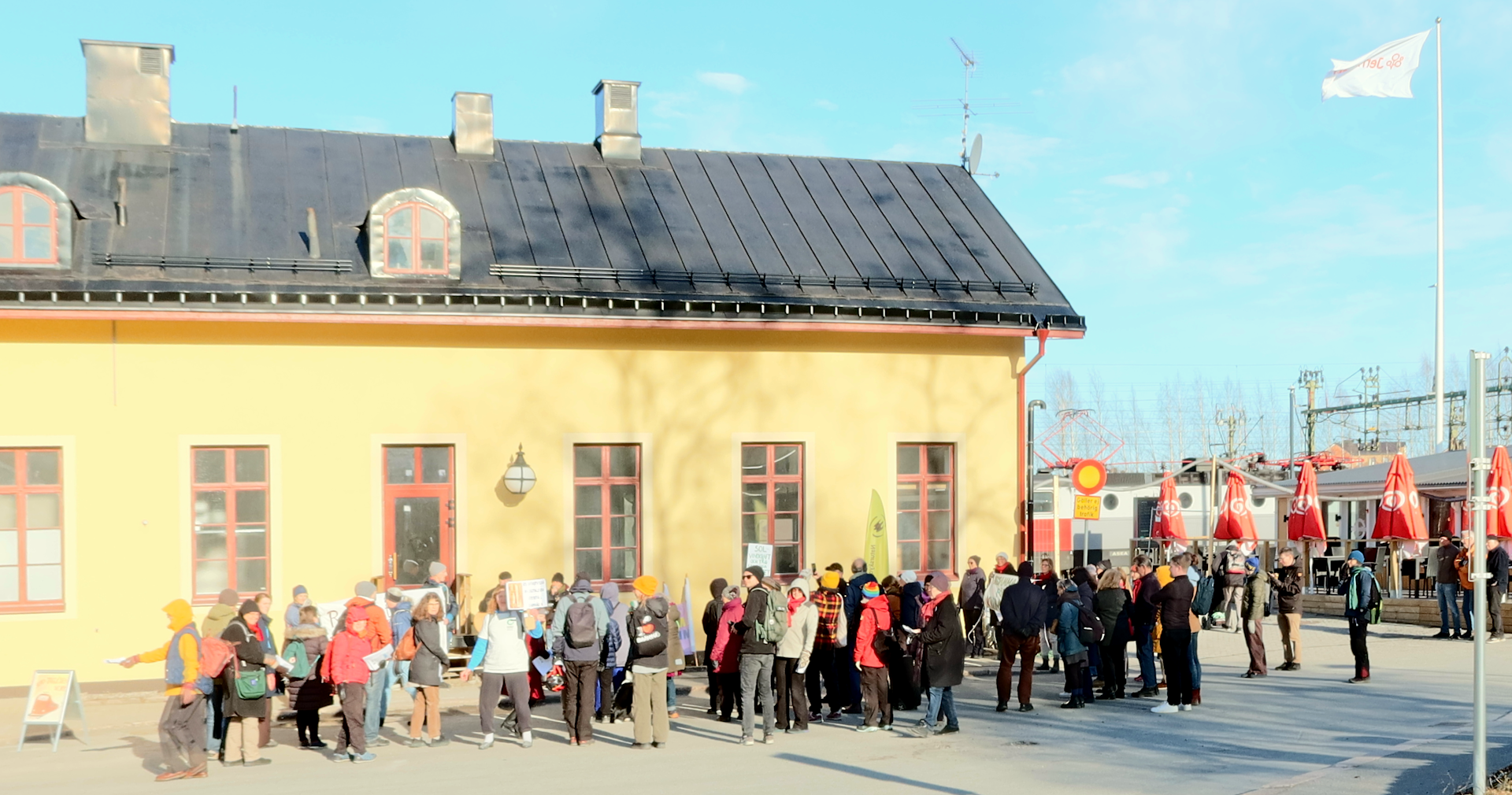 AktiviteterArkiverade tidigare aktiviteter Klicka på en bild för att se den i full upplösning. 2026-04-09 och 2026-04-10 Stafetten kommer till Luleå, Boden och UmeåTvå grupper miljöaktivister reser under början av aprilmånaden genom Sverige, i mån av tillgänglighet med tåg, dels från Abisko söderut, och dels genom södra Sverige, och möts till sist i Stockholm för att genomföra en politikerutfrågning (KK, OO) och en stor klimatmarsch i syfte att köra högerfascisterna ut ur regeringskansliet. Aktionen kallas för Stafetten eller Valstafetten. Stafetten sysslar med antihögerpolitik med fokus på klimat och miljö, men tar upp även några andra frågor såsom rättvisa och migrationsväsendet AKA deportationsväsendet. På onsdag 2026-04-08 började den norra gruppen med en hyfsat stor demo (bild)i Abisko, detta trots att en del deltagare söderifrån inte nådde fram pga tågstrul. Tåget väntade ca 30 minuter i Älvsbyn pga ett påstått växelfel i Boden. Då tåget äntligen nådde staden Boden, stannade det ca 3 Km före stationen (som fortfarande heter "centralstation" trots att den är den enda järnvägsstation inom hela kommunen), föraren vägrade öppna dörrarna, och efter ett tag fick resenärerna veta att tåget ska köra tillbaka till Älvsbyn där de skulle byta till en ersättningsbuss. Look what's happening in Sweden. På torsdag 2026-04-09 var Stafetten aktiv i Luleå, Boden och Älvsbyn. Under kvällen reste gruppen till Umeå, och kunde i Boden bevittna en ilsken resenär som efter intensiv användning av "moderna" digitala kommunikationskanaler under 3 dagar inte lyckades få sanningsenlig information, och körde med hyrbil från Giron till Boden, trots att det till sist fanns en ersättningsbuss, och tåget väntade på den. "Jag ska aldrig åka tåg igen, det här funkar helt enkelt inte!" var dagens slutsats för denna resenär. Look what's happening in Sweden. Ankomsten till Älvbyn var försenad med en timme, men ett fint gäng väntade kvar på perrongen för en träff som dröjde ca en minut innan tåget körde vidare. Ankomsten till Umeå var försenad med ca 1+1/2 timmar, tågförseningar växer lika tillförlitligt som kancertumörer eller gruvor, det är bara så. Två mindre gäng delade ut flygblad på både Umeå Central och Umeå Östra omkring kl 21 som var tågets avsedda passertid, men ingen var kvar då tåget var framme. På fredag 2026-04-10 var Stafetten aktiv i Umeå, och utökade den traditionella fredagsdemonstrationen på Rådhustorget från kl 12. Senare kl 15 blev det ett inomhusevenemang på Väven (stadsbiblioteket) med flera talare inklusive Arne Müller, och efterföljande diskussion. Avgången vidare söderut blev senarelagd från fredag kväll till lördag morgon, därmed föll också den tidigare övervägda aktionen på Cetralstationen bort. ![]() Demo framför järnvägsstationen i Luleå med stöd från Umeå ![]() Demo framför järnvägsstationen i Luleå med stöd från Umeå ![]() Demo framför järnvägsstationen i Boden med stöd från Umeå ![]() Protest i stationshuset i Boden mot ett dysfunktionellt heldigitaliserat biljetteringssystem ![]() Demo på Rådhustorget i Umeå, Mattias talar om skog och träplantager, och strategin att driva frågan via Luleå kommun och sedan Umeå kommun, i bakgrunden syns järnvägsstationen ![]() Välbesökt föredrag på Väven (bilden är Public Domain i den mån den kan vara det utifrån tänkbar tredjeparts upphovsrätt på loggan på duken) 2026-03-28 Demonstration mot brytning i alunskifferJordens Vänner Umeå deltog i en demonstration mot brytning i alunskiffer, övrig extraktivism, nya kärnreaktorer och statlig kärnvapenterrorism på Rådhustorget i Umeå, 2026-03-28, lördag, början kl 14:00. Arrangörer och delaktiga var nätverket "Sverige mot brytning i alunskiffer" (ingen webbplats, men en insändare finns), Fältbiologerna Umeå, Jordens Vänner Umeå, Naturskyddsföreningen Jämtland (mer info om alunskiffer), Amnesty Sapmi, MittSkifte (online namninsamling och mer info om alunskiffer). Talare: Taylor, Jordens Vänner Umeå (talet), Erik D, nätverket "Nej till uranbrytningen". Samma dag anordnades det demonstrationer i samma ärende på 4 ställen, nämligen Umeå, Vilhelmina, Östersund och Skövde. ![]() Affisch i Lycksele (bilden är Public Domain i den mån den kan vara det utifrån tänkbar tredjeparts upphovsrätt på affischerna) ![]() ![]() ![]() ![]() 2026-03-21 Demonstration mot USAJordens Vänner Umeå deltog med en talare (talet) i en demonstration i centrala Umeå mot USA och deras notoriska krigande och miljöförstöring. 2026-01-31 Socialistiskt Forum 2026Jordens Vänner Umeå och några andra miljöorganisationer närvarade med bokbord vid "Socialistiskt Forum 2026" i Umeå. Arrangörer var LO-facken i Umeå, Socialdemokraterna i Umeå, Vänsterpartiet i Umeå, Ung Vänster, SSU, ABF Umeåregionen, ABF-distriktet i Västerbotten, Kulturföreningen Pilgatan (Bokcafé Pilgatan), Unga Örnar Umeå. ![]() 2025-12-13 LuciademoPå Luciadagen (lördag) ägde rum den nästan traditionella demonstrationen för "Klimat, Fred och Humanism" anordnad av den samlade miljörörelsen och fredsrörelsen i Umeå. Avgång kort efter kl 12:00 från Järnvägstorget till Renmarkstorget där det hölls korta tal. Jordens Vänner Umeå samlades under banderollen "Rädda Nattåget", vi intervjuades av SVT, och delade ut flygblad om nattågsnerdragningarna. Efter demonstrationen följde kl 13:00 ett evenemang inomhus. ![]() Vår bandelroll "Rädda Nattåget" på Järnvägstorget, Umeå Centralstation i bakgrunden ![]() Vår bandelroll "Rädda Nattåget" på Renmarkstorget ![]() Renmarkstorget, flera av Jordens Vänner Umeå syns 2025-11-06 Presentation "Grön omställning eller business as usual"Presentation "Grön omställning eller business as usual" med anledning av den nyligen hållna gruvkonferensen i Älvsbyn (2025-10-04 till 2025-10-05 arrangerad av