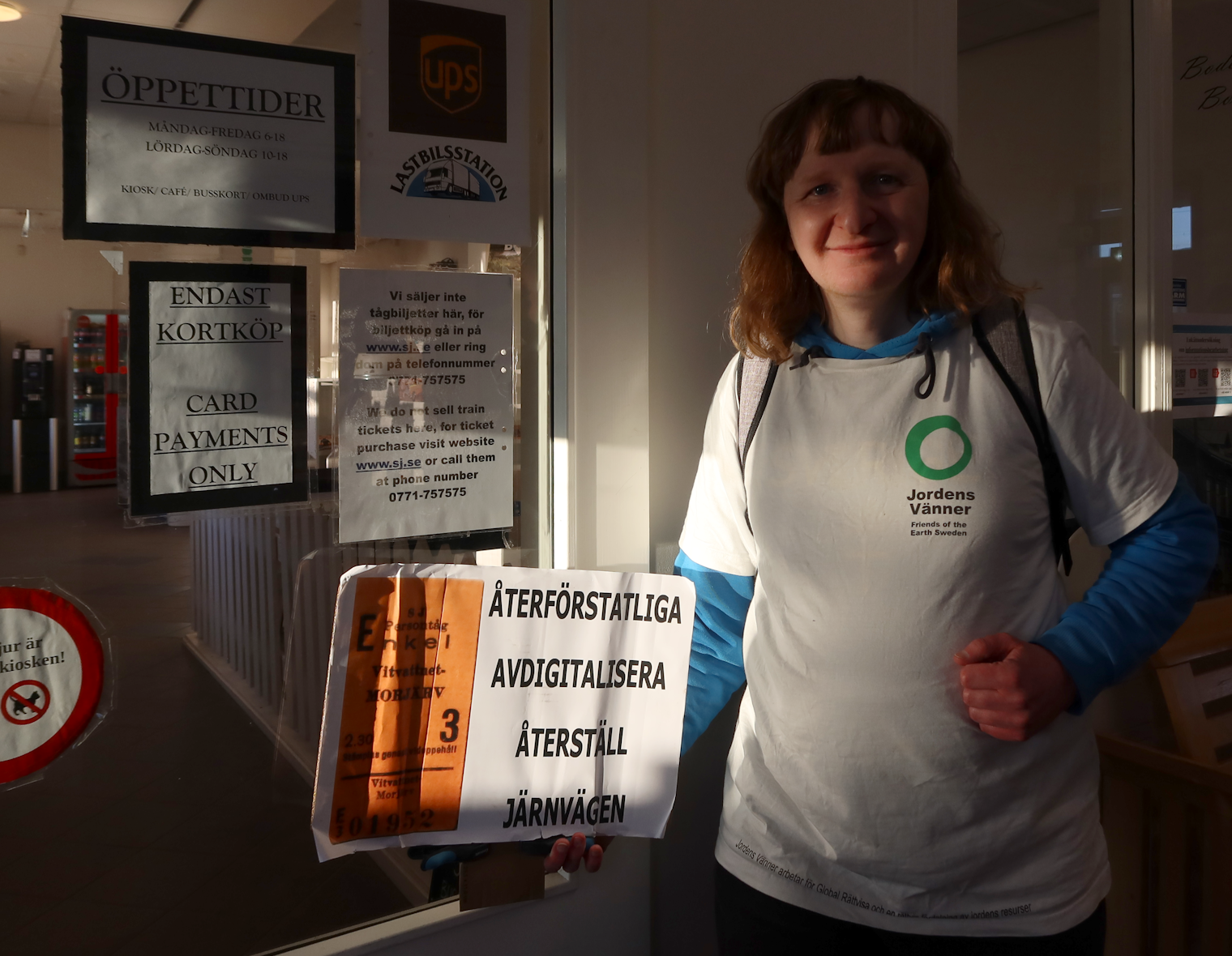 ca 1990 Jordens Vänner Umeå lånade ett tågNågon gång i början av 1990-talet var två tomma tåg på väg från Skåne till Malmbanan via Vännäs. Jordens Vänner Umeå (eller snarare föregångarorganisationen till oss) lyckades då låna ett tåg (typ "Asea X10", eller "SL X10", eller "Pågatåg", wikipedia, wikidata, commons) för några timmar, och köra det till Umeå. ![]() Tåget lånat av Jordens Vänner på Umeå Centralstation ![]() Tåget lånat av Jordens Vänner i Vännäs ![]() Tåget lånat av Jordens Vänner i Vännäs De här fotona är en hälsning från en annan tid. Fotona togs på film, och genomgick en kemisk framkallningsprocess. Bottniabanan fanns inte, tåg från söder (Skåne, Göteborg, Stockholm) till Malmbanan (Luleå, Boden, Kiruna, Narvik) gick via inlandet, alltså Ånge, Bräcke, Vännäs, Jörn, och missade Umeå (på samma sätt som de nu år 2026 fortfarande missar Skellefteå). Sverige var redan bilberoende, men inte så extremt som det är nu, E10:an hade då varit genomgående från Luleå till Narvik sedan bara några år tillbaka, och bara som en vanlig tvåfilig väg, och också E4:an var från Uppsala hela vägen norrut bara en vanlig tvåfilig väg. På Umeå centralstation fanns en biljettlucka där det gick att köpa tågbiljetter med kontanter. |